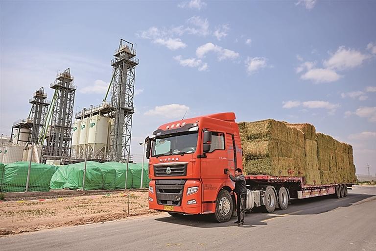 在內(nèi)蒙古赤峰市阿魯科爾沁旗,滿(mǎn)載牧草的貨車(chē)準(zhǔn)備啟程。新華社發(fā)