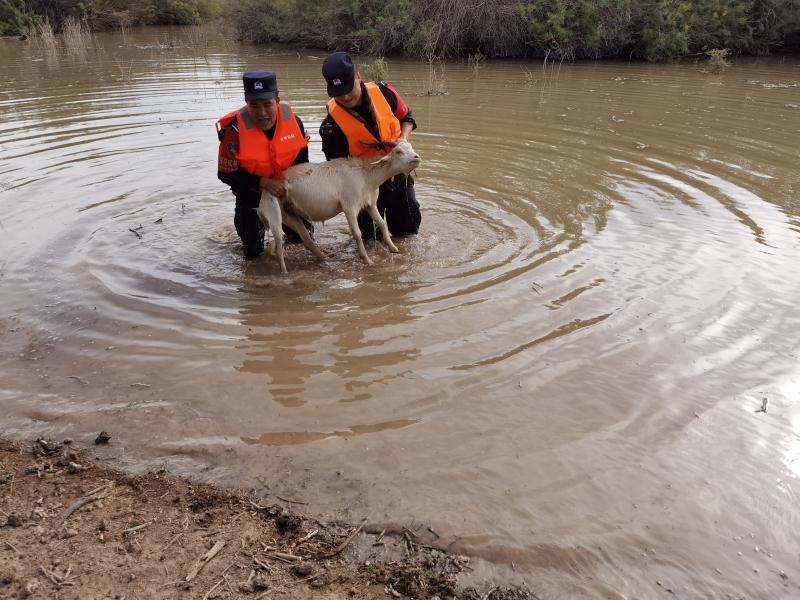 “請民警同志幫幫忙,我的羊群被困在河里了,這可是我的命根子??!”2020年9月8日8時許,蘇泊淖爾邊境派出所一個報警電話打破了清晨的寧靜,來電的是內蒙古額濟納旗蘇泊淖爾蘇木牧民布某。原來,夜里黑河漲水,他家的幾十只羊被困,望著身陷險境的羊群,焦急的布某打通了派出所的報警電話。