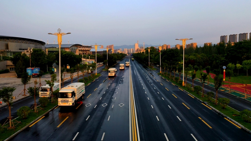 當東方微微發(fā)白,高壓沖洗車強力開路,將道路上的廢棄物、積灰沖到道路兩側。