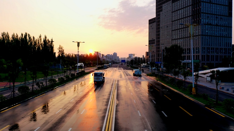 凌晨6點,晨曦初露,朝霞輕染,被稱作“高霧炮”的多功能抑塵車和高壓水車開始霸氣地聯(lián)合作業(yè),一道道水霧騰空而起或四散鋪開,清潔降塵,提高空氣濕度。
