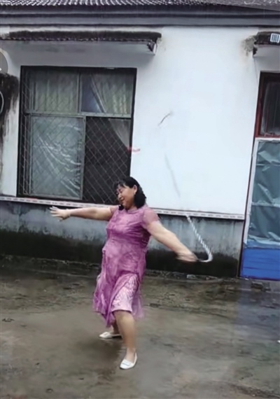 “清水河”大媽與抖音的相遇是在3年前。當(dāng)時,遭遇了親人離世的她悲傷難抑,為了讓她分散注意力,她的女兒幫她下載了抖音。此后,大媽時常刷刷抖音,也慢慢從中悟出了一個道理,就是生活中不如意十之八九,人要好好活著,要快樂地活著。很快,大媽就從悲傷中走了出來,也學(xué)著在抖音上拍攝自己的日常。雖然起初視頻點(diǎn)贊量不多,但能記錄下生活的點(diǎn)滴足以讓她格外開心。一直到了去年9月份,大媽無意之中發(fā)布了一條雨中甩鞭子的視頻。視頻中,大媽身著一襲紅裙,有節(jié)奏地甩起了十幾斤重的鐵制麒麟鞭?!芭距⑴距?、啪嗒……”聲聲響亮、威風(fēng)凜凜。就是這條視頻讓她一夜爆紅。此后短短幾天,這條視頻的點(diǎn)贊量就突破了200萬,一時間,抖音上還掀起了一陣和大媽合拍的熱潮。