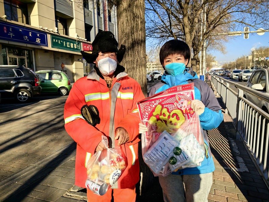 大家身穿志愿者馬甲,三五人一組結(jié)伴走上街頭,只要見到正在工作的環(huán)衛(wèi)工人,就會(huì)遞上一份節(jié)日暖心包,里面有臘八粥、小點(diǎn)心、春聯(lián)福字、兔年吉祥物裝飾卡片,還有酒精、口罩等防疫物資。
