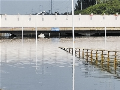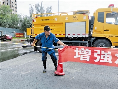 在這之前,通遼市排水管理處已啟動應(yīng)急預(yù)案,搶險人員及應(yīng)急搶險車輛陸續(xù)就位。負責明仁立交橋排水搶險的第2小組的4名成員兵分兩路,需要勸退東、西兩側(cè)準備過橋的汽車司機和行人,以及排布車輛、施拉警界線……橋西邊,污水管道維護隊車隊隊長張再智邊忙著手里的活兒,邊通過對講機呼叫副隊長盛博,催促他趕緊向過往的車輛及行人喊話,提醒大家橋下水深不能通行。此時,盛博已駕車由西向東行至立交橋南側(cè)的輔路上,雨水遮住了視線,雨刮器速度越來越快,他邊回應(yīng)張再智,邊放慢車速向人們喊話。