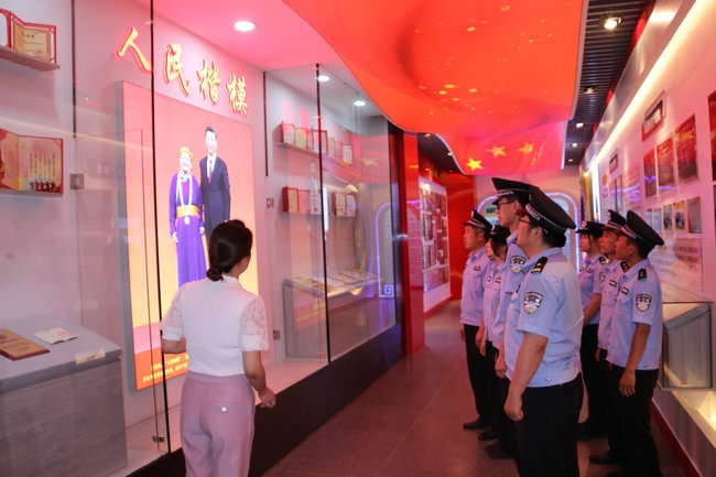 習(xí)近平新時代中國特色社會主義思想實踐基地由四子王旗委政府于2021年5月建成,總面積460平米,展廳內(nèi)展出圖片241張、文字展板34塊、視頻資料12個,分黨史學(xué)習(xí)教育、都貴瑪先進事跡、新時代文明實踐中心三個展廳,力圖打造成鞏固民族團結(jié)大局、鑄牢中華民族共同體意識的紅色教育主陣地。在黨史學(xué)習(xí)教育展廳,全體黨員民警通過多媒體技術(shù),深入了解了黨的歷次代表大會主要內(nèi)容、我們黨理論探索的發(fā)展歷程和中國共產(chǎn)黨人的精神譜系以及習(xí)近平總書記對內(nèi)蒙古的重要囑托,重溫了習(xí)近平總書記“七一”重要講話精神,引導(dǎo)黨員民警牢記初心使命,時刻銘記黨性是黨員立身、立業(yè)、立德的基石。在都貴瑪先進事跡展廳,大家通過視頻、照片、文字、連環(huán)畫等方式細致了解了“草原母親”都貴瑪養(yǎng)育28名孤兒和挽救40多位產(chǎn)婦的感人事跡,共同回憶了都貴瑪老人與邊防官兵、移民管理警察相處的點點滴滴。大家被都貴瑪老人身上“初心如炬 大愛無疆”的精神深深折服,深切感受到榜樣的力量。在新時代文明實踐中心展廳,大家還了解到駐地四子王旗新時代文明實踐工作的重要舉措和成果,通過對照人民楷模和道德模范,深入開展深刻檢視,進一步強化了黨員民警建設(shè)美麗邊疆、維護安全穩(wěn)定的信心決心。