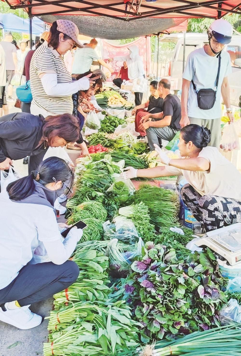 夏日的早市里,菜攤攤主牛麗梅就已經(jīng)擺放好新鮮的蔬菜,泡沫箱里的黃瓜頂著嫩黃的花,筐里的西紅柿還帶著露珠,“這些菜都是半夜起來(lái)從地里現(xiàn)摘的,你看看這黃瓜頂花帶刺的,多新鮮。我已經(jīng)在這個(gè)早市擺了十來(lái)年攤了,人們還是很認(rèn)可我家的蔬菜,就是累點(diǎn)也覺(jué)得挺高興的?!彼裏崆榈卣泻糁皝?lái)買(mǎi)菜的市民,過(guò)秤、算賬,干脆利落,一看就有著豐富的賣(mài)菜經(jīng)驗(yàn)。