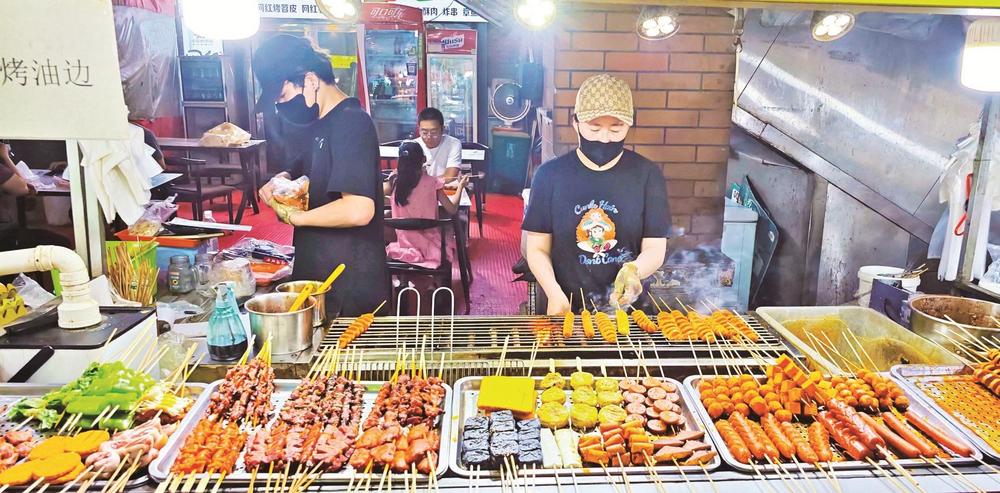 炭火上的羊肉串嗞嗞作響,油脂滴落,迸出金色火花,散發(fā)出誘人的香氣??腿藝谒芰闲∽琅裕掷锬弥?zhèn)啤酒,碰杯傳出清脆的響聲……這里沒(méi)有高檔餐廳的拘謹(jǐn),只有朋友相聚的歡樂(lè)和大口吃肉的暢快。大學(xué)生徐瑞虹放暑假后,經(jīng)常和朋友來(lái)夜市消暑?!拔覀儙讉€(gè)沒(méi)事就來(lái)萬(wàn)達(dá)金街轉(zhuǎn)一轉(zhuǎn),天太熱了,待在家里也悶,而且夜市里的這些小吃我們都比較喜歡,沒(méi)事幾個(gè)人喝幾瓶啤酒,聊一聊天,感覺(jué)還是很愜意的。”對(duì)于年輕人來(lái)說(shuō),夜市不僅是美食的聚集地,更是釋放壓力、享受生活的好去處。在這里,他們可以暫時(shí)拋開(kāi)煩惱,盡情享受美食帶來(lái)的快樂(lè)。