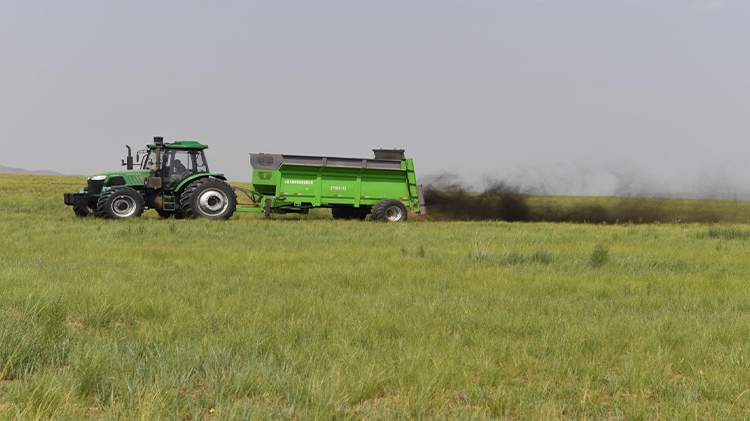 在退化放牧場(chǎng)治理區(qū),施工人員用推土機(jī)推平坑洼不平的風(fēng)蝕坑、整理?xiàng)壨炼?;按照噴幅?~8米的行距,用拋肥機(jī)將牛羊固態(tài)糞肥和含有氮、磷、鉀等生物有機(jī)液態(tài)肥拋灑在草場(chǎng)上,增加土壤肥力;用切根機(jī)將稀疏的羊草切開、促進(jìn)分蘗繁殖、復(fù)壯,增加種群密度;采用栽設(shè)4×4米網(wǎng)格狀沙幛、覆蓋草簾來降溫保墑抗旱保苗,與此同時(shí)與項(xiàng)目區(qū)牧戶簽訂三年的禁牧、生態(tài)補(bǔ)償、管護(hù)協(xié)議。