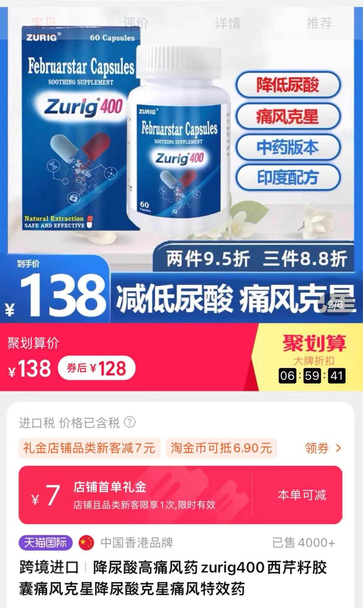 此外,zurig400在銷售頁(yè)面還模仿印度zurig80,宣稱降尿酸、痛風(fēng)藥。澎湃新聞?dòng)浾哒{(diào)查發(fā)現(xiàn),zurig400目前在多個(gè)網(wǎng)購(gòu)平臺(tái)有售,有商家顯示已出售4000+。 經(jīng)了解后得知,印度zurig80實(shí)際上是一款仿制藥,目前國(guó)內(nèi)并未獲批上市;而zurig400卻是一款香港產(chǎn)的保健品類目產(chǎn)品,并非藥品。但產(chǎn)品宣傳時(shí)卻使用“痛風(fēng)特效藥”“印度配方”“中藥非布”等詞語,讓患者產(chǎn)生誤會(huì)。