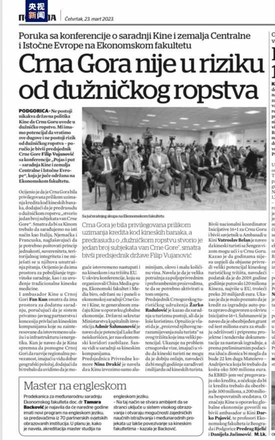 當(dāng)?shù)貢r間3月22日,由中央廣播電視總臺歐洲拉美地區(qū)語言節(jié)目中心主辦、黑山媒體局視頻門戶網(wǎng)站和黑山大學(xué)經(jīng)濟(jì)學(xué)院共同承辦的“中國式現(xiàn)代化與世界新機(jī)遇”研討會在黑山首都波德戈里察舉行。黑山名譽總統(tǒng)武亞諾維奇、中國駐黑山大使范琨、黑山資本投資部國務(wù)秘書沙赫馬諾維奇、黑山前駐華大使帕約維奇等政要、專家學(xué)者、媒體代表及青年學(xué)生共200余人參會。