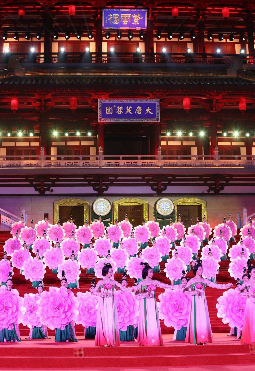 習(xí)近平夫婦為貴賓舉行唐朝傳統(tǒng)迎賓儀式。紫云樓前,禮樂(lè)和鳴,明快有力的古代佾舞、絢麗婀娜的芙蓉花舞,表達(dá)了古都西安人民的熱情好客,體現(xiàn)了中華文化兼容并蓄的精神風(fēng)貌。
