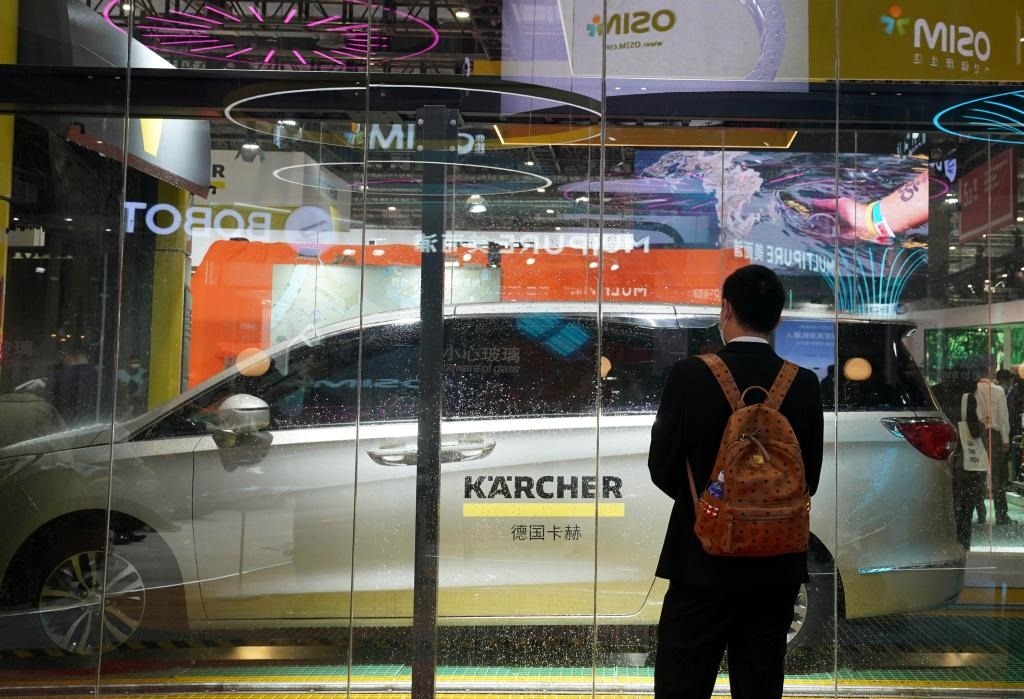 2021年11月6日,觀眾在第四屆進博會德國卡赫展臺參觀全自動洗車機器人的演示。(新華社記者劉穎攝)