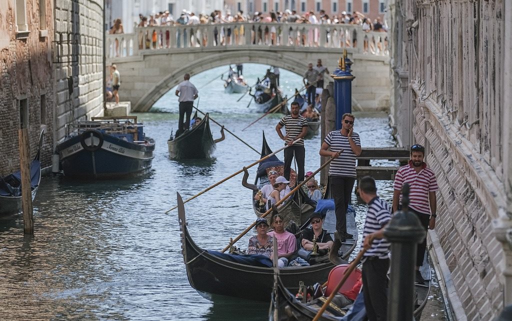 當(dāng)?shù)貢r(shí)間2023年8月2日,意大利威尼斯,交通擁擠,船夫們在索斯皮里橋附近緩慢前行。
