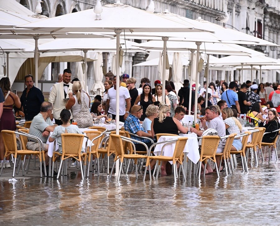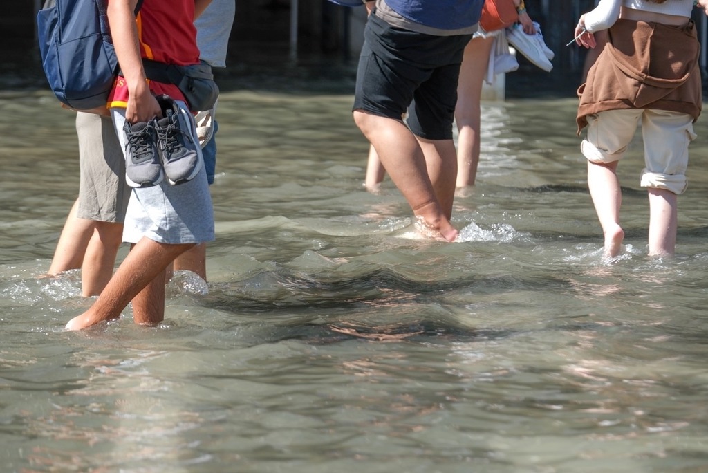 當(dāng)?shù)貢r(shí)間2023年8月6日,意大利威尼斯,游客走在積水的道路上。