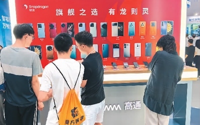 觀眾在高通展區(qū)體驗搭載驍龍移動平臺的智能手機(jī)。
