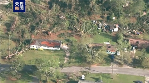 當?shù)貢r間4月3日,美國佐治亞州羅克代爾縣遭遇龍卷風(fēng)襲擊。航拍畫面顯示,當?shù)氐姆课莺蜆淠驹獾絿乐仄茐摹?/p>