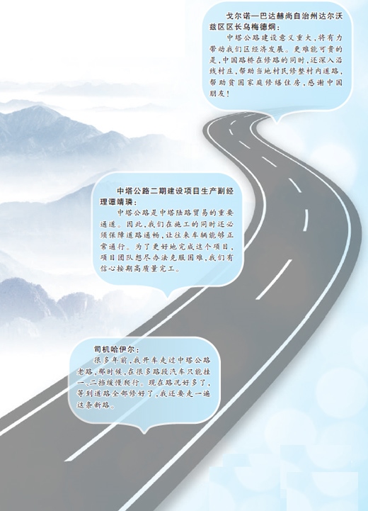 目前,中塔公路二期建設項目已完成全線60%左右的路面攤鋪工作,極大地改善了當地通行狀況??ㄜ囁緳C穆罕默德經常跑中塔公路,特別關注項目進展。從前,這條路上山體滑坡是常事,車輛總被滯留途中,一耽誤就是好幾天?!艾F在路況有了很大改善,路上的貨車也越來越多了?!蹦潞蹦抡f。