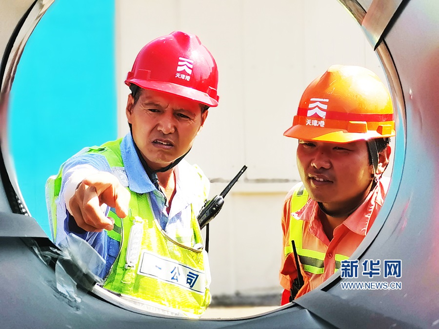 天津港航建設(shè)工人冒著酷暑在天津港c段碼頭建設(shè)現(xiàn)場(chǎng)檢查鋼筋情況。新華網(wǎng)發(fā)