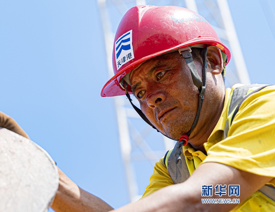 烈日當(dāng)空,建設(shè)工人在天津港c段智能化集裝箱碼頭建設(shè)現(xiàn)場(chǎng)進(jìn)行安裝樁體工作。新華網(wǎng)發(fā)