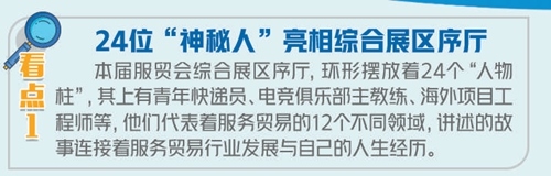 穿過(guò)展示屏區(qū)域,可以看到24根“人物柱”,上面展示著來(lái)自服務(wù)貿(mào)易十二大領(lǐng)域“行業(yè)故事講述人”的工作和生活故事。