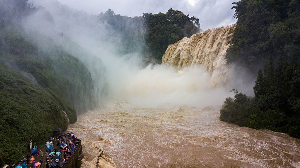 受強(qiáng)降雨影響,貴州黃果樹(shù)瀑布迎來(lái)2020年入汛以來(lái)最大水量,黃果樹(shù)瀑布水勢(shì)磅礴。陳熙/攝