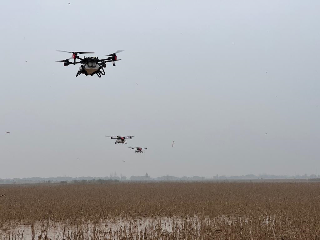 很快,渭南綠盛現(xiàn)代農(nóng)機(jī)專業(yè)合作社理事長(zhǎng)石宇峰就帶著3臺(tái)極飛農(nóng)業(yè)無(wú)人機(jī)來(lái)到地旁,準(zhǔn)備作業(yè)。記者看到,農(nóng)業(yè)無(wú)人機(jī)全程由專業(yè)人員操作,裝種、起飛,按規(guī)劃好的線路和高度在空中播撒,種子沒了再返航續(xù)加,幾個(gè)小時(shí)就完成了飛播。