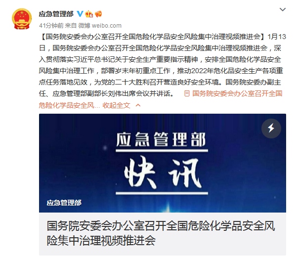1月13日,國務(wù)院安委會(huì)辦公室召開全國危險(xiǎn)化學(xué)品安全風(fēng)險(xiǎn)集中治理視頻推進(jìn)會(huì),安排全國危險(xiǎn)化學(xué)品安全風(fēng)險(xiǎn)集中治理工作,部署歲末年初重點(diǎn)工作,推動(dòng)2022年?;钒踩a(chǎn)各項(xiàng)重點(diǎn)任務(wù)落地見效,為黨的二十大勝利召開營造良好安全環(huán)境。