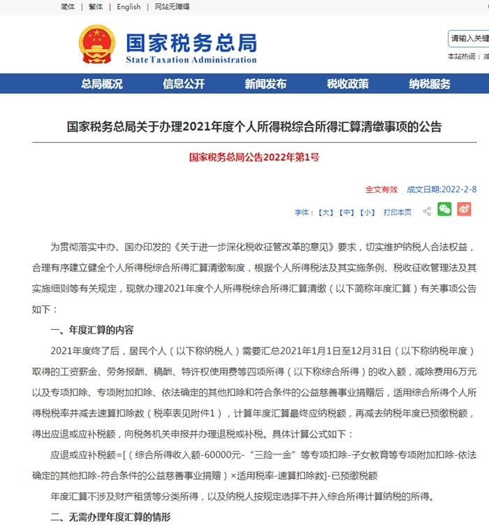 為貫徹落實(shí)中辦、國辦印發(fā)的《關(guān)于進(jìn)一步深化稅收征管改革的意見》要求,切實(shí)維護(hù)納稅人合法權(quán)益,合理有序建立健全個人所得稅綜合所得匯算清繳制度,根據(jù)個人所得稅法及其實(shí)施條例、稅收征收管理法及其實(shí)施細(xì)則等有關(guān)規(guī)定,現(xiàn)就辦理2021年度個人所得稅綜合所得匯算清繳(以下簡稱年度匯算)有關(guān)事項公告如下: