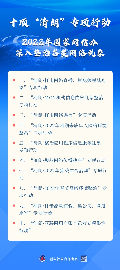 “實(shí)踐證明,開展‘清朗’系列專項(xiàng)行動(dòng),集中整治各類網(wǎng)絡(luò)亂象,是網(wǎng)絡(luò)生態(tài)治理的重要方式,也是維護(hù)億萬(wàn)網(wǎng)民精神家園的有效手段?!眹?guó)家網(wǎng)信辦副主任盛榮華在會(huì)上表示,2022年“清朗”系列專項(xiàng)行動(dòng)將聚焦影響面廣、危害性大的問(wèn)題開展整治,做到“三個(gè)更加突出”,即更加突出回應(yīng)網(wǎng)民關(guān)切,更加突出對(duì)癥下藥,更加突出效果導(dǎo)向。