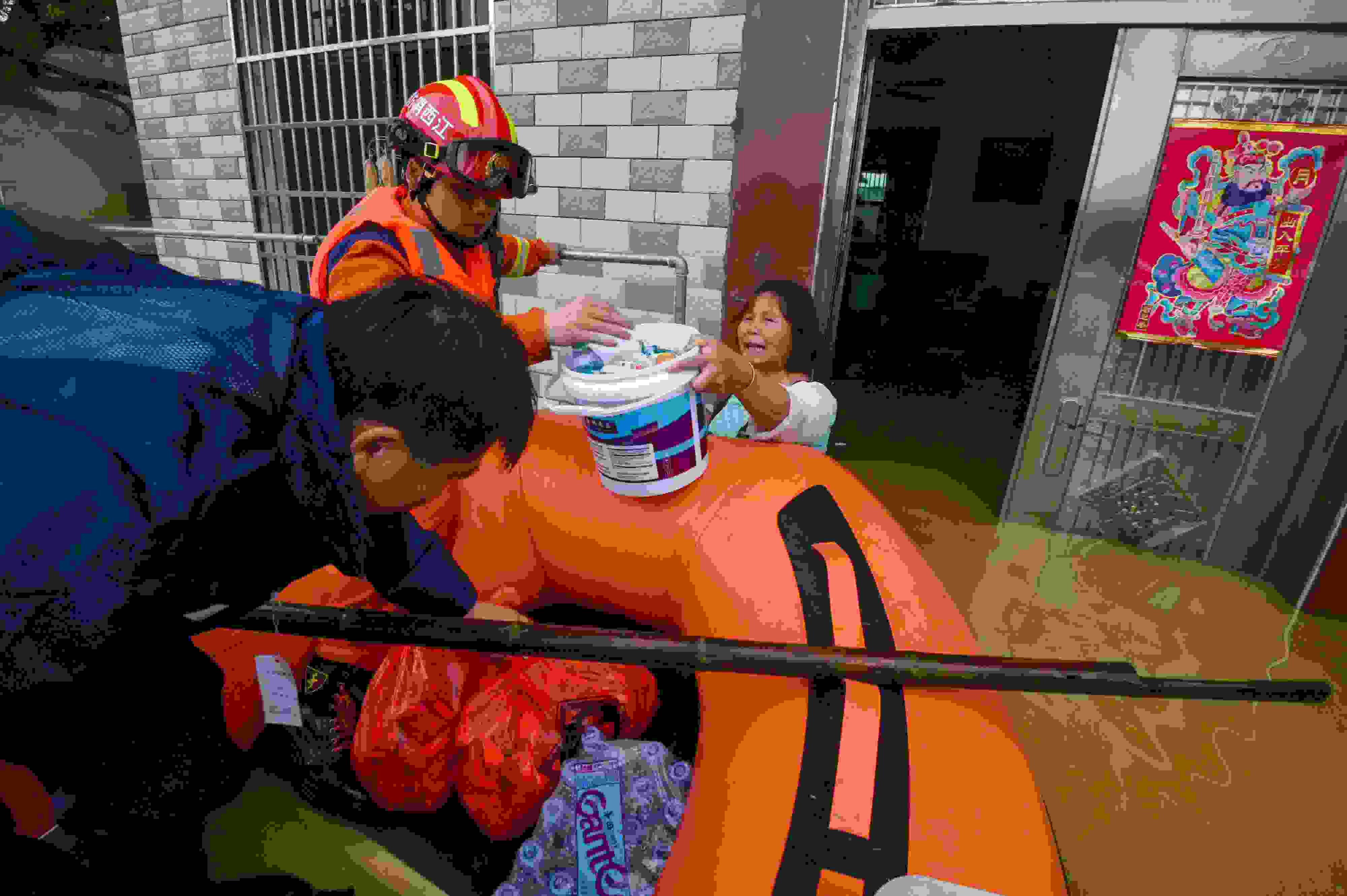 2023年5月6日,江西吉安,新干縣消防救援大隊(duì)隊(duì)員在麥斜鎮(zhèn)拿埠村給受困群眾運(yùn)送生活物資。 視覺(jué)中國(guó)