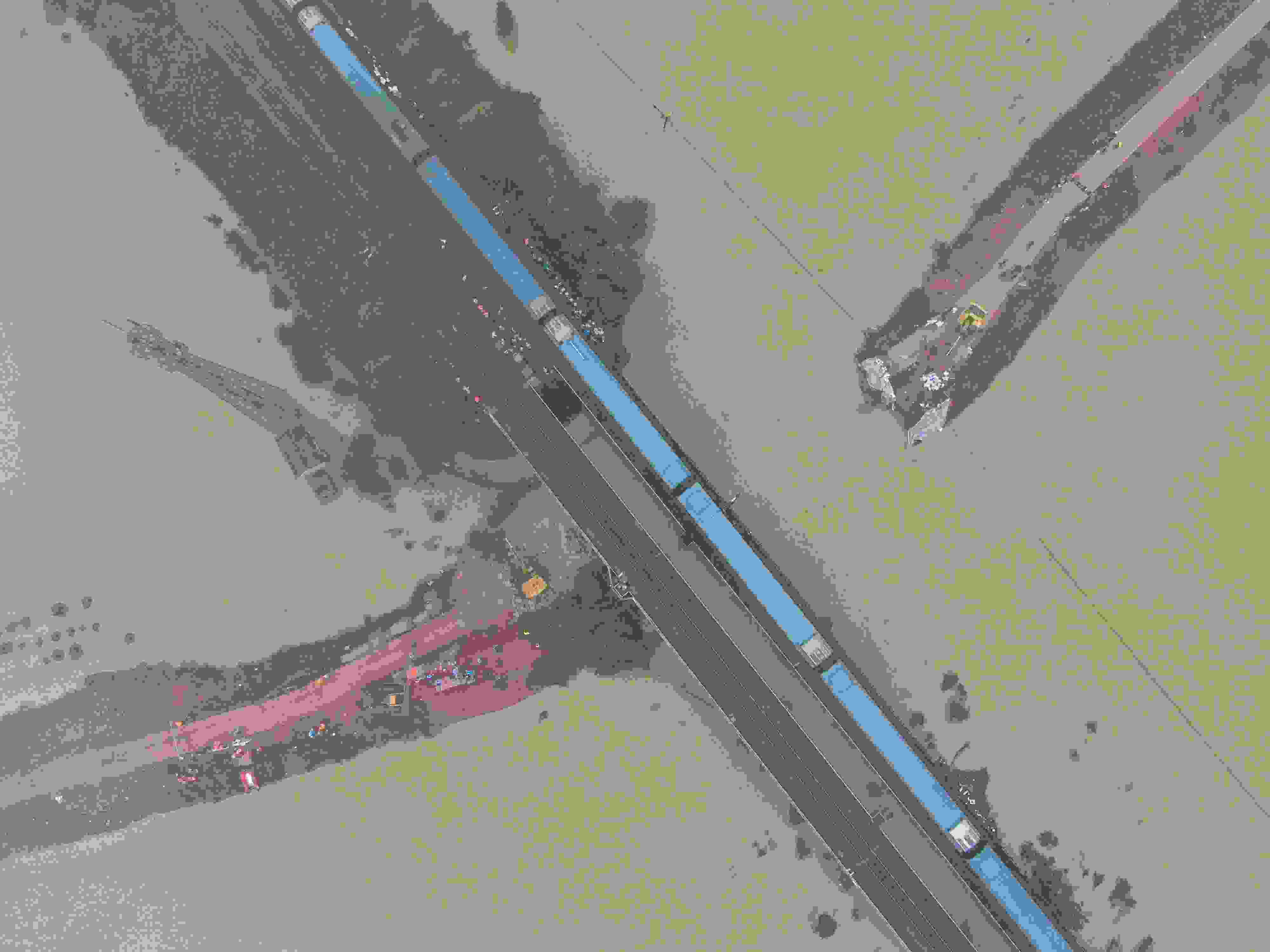 2023年5月6日,江西宜春,航拍清豐堤河堤潰口現(xiàn)場(chǎng),一列火車從潰口上方的鐵路橋上經(jīng)過(guò),橋下的救援隊(duì)伍正在開展搶險(xiǎn)救援工作。 視覺(jué)中國(guó)