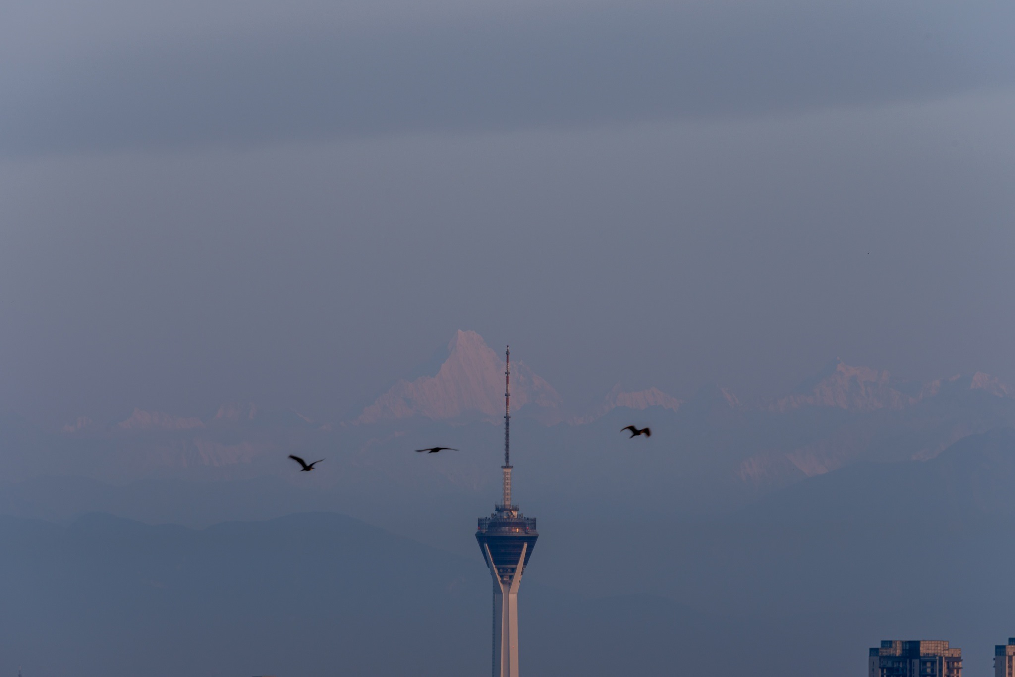 成都:幺妹峰露出真容 與城市建筑同框