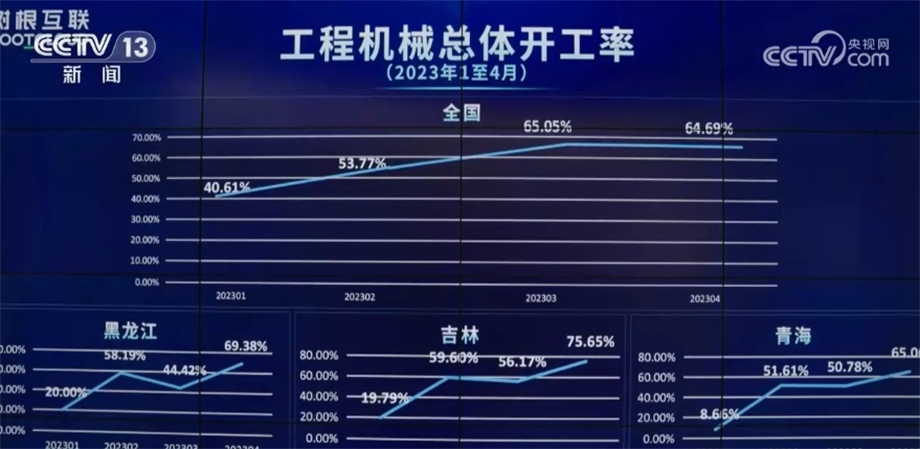 這個大屏幕反映的是全國挖掘機的開工情況,相關(guān)負責(zé)人告訴記者,“挖掘機指數(shù)”顯示出今年我國工程機械行業(yè)開始出現(xiàn)回暖跡象。4月份,全國工程機械總體開工率為64.69%,環(huán)比3月基本持平。12個?。▍^(qū)、市)創(chuàng)下今年以來最好成績。