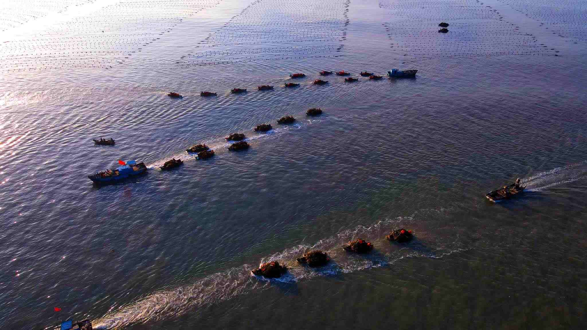 2023年5月31日,山東威海,榮成愛倫灣海洋牧場(chǎng),漁民駕駛船只在海上收獲海帶,美麗的朝霞倒影在海上,海鷗伴舞,海洋牧場(chǎng)到處呈現(xiàn)一派豐收的喜人景象。視覺中國(guó)