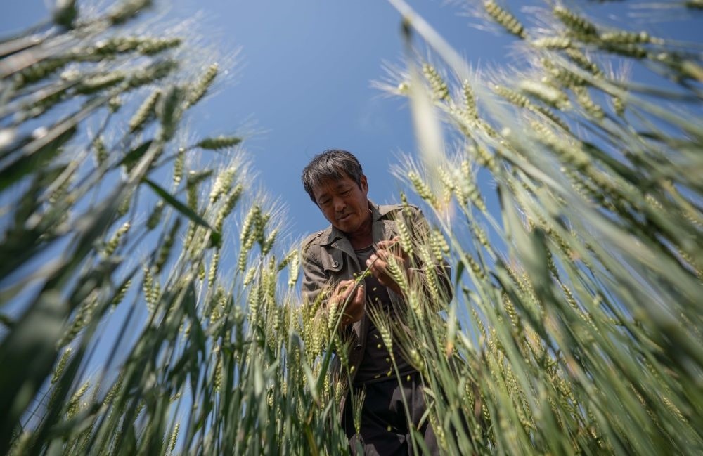 5月23日,農民在河北滄州渤海新區(qū)黃驊市福源種植合作社的麥田里查看鹽堿地小麥長勢。新華社記者 駱學峰 攝