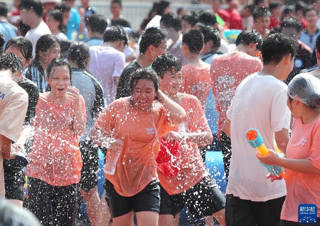 6月2日,學(xué)生們享受潑水活動帶來的快樂。