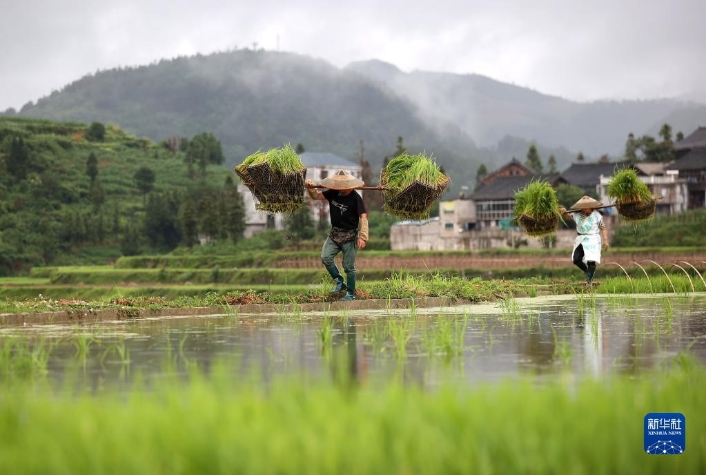 6月5日,貴州省黔東南苗族侗族自治州丹寨縣揚武鎮(zhèn)長青社區(qū)村民在田間挑運水稻秧苗。
