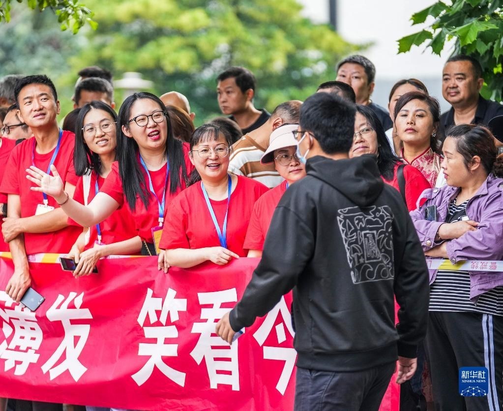 6月7日,在北京師范大學(xué)附屬實驗中學(xué)考點門口,考生家長給考生加油打氣。