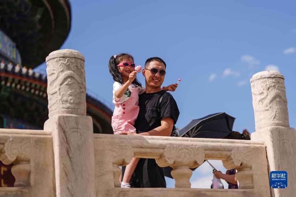 6月9日,游客在藍天白云下的天壇祈年殿游覽。