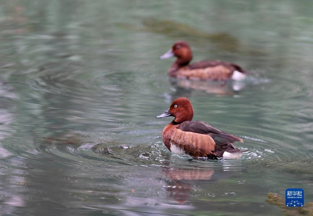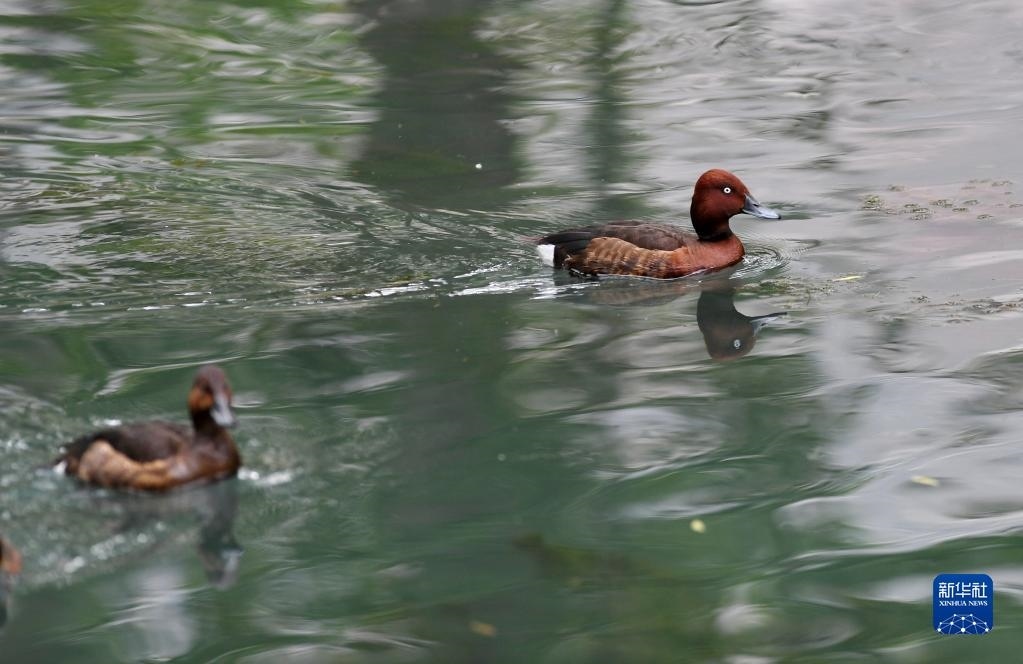 夏日里,白眼潛鴨和鳳頭潛鴨在西藏拉薩市拉魯濕地國(guó)家級(jí)自然保護(hù)區(qū)中干渠里覓食、嬉戲。新華社記者 張汝鋒 攝