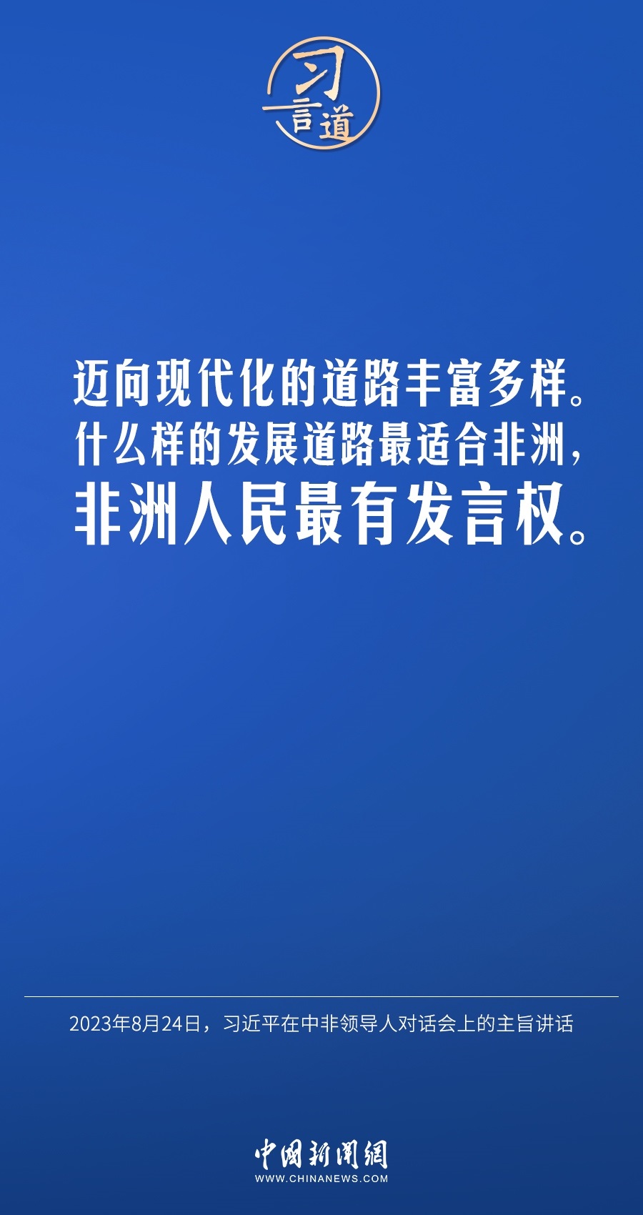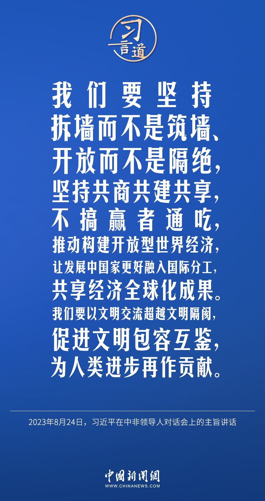 當(dāng)?shù)貢r間8月24日晚,國家主席習(xí)近平和南非總統(tǒng)拉馬福薩在約翰內(nèi)斯堡共同主持中非領(lǐng)導(dǎo)人對話會。習(xí)近平發(fā)表題為《攜手推進現(xiàn)代化事業(yè) 共創(chuàng)中非美好未來》的主旨講話。習(xí)近平指出——