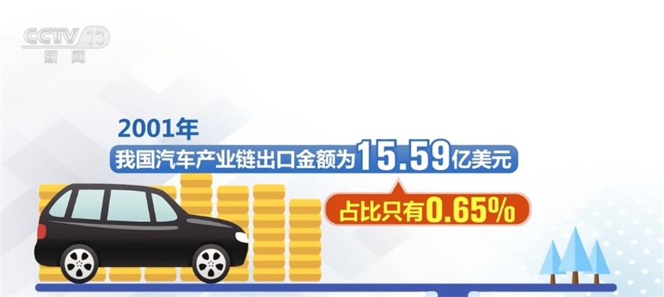 中國(guó)貿(mào)促會(huì)汽車分會(huì)負(fù)責(zé)人表示,2001年,我國(guó)汽車產(chǎn)業(yè)鏈出口金額為15.59億美元,占比只有0.65%。今年前8個(gè)月,這個(gè)數(shù)字達(dá)到1219.93億美元,占比提升至5.5%。