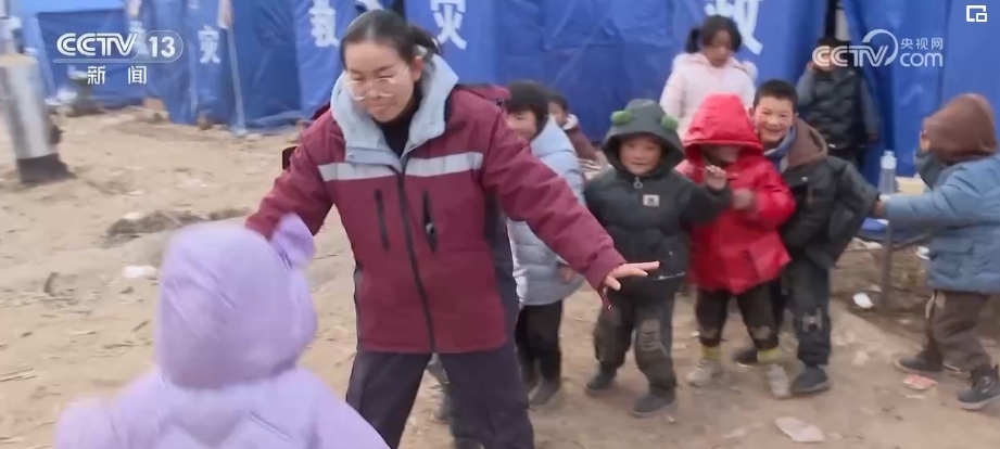 在康吊村三社的臨時(shí)安置點(diǎn),來自甘肅省第二人民醫(yī)院的心理治療師李轉(zhuǎn)雄正帶著村里的孩子做游戲。丟手絹、老鷹抓小雞,在一遍又一遍的追逐當(dāng)中,孩子們的笑聲越來越響亮。