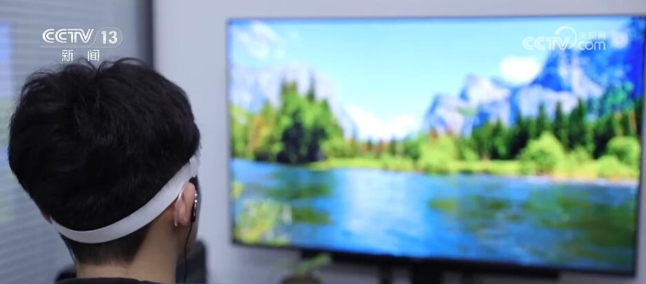 總臺記者 何俊儒:我們現(xiàn)在也進到了這樣的一個專注力訓(xùn)練的房間,我們可以試一下。那我們可以看到這邊的畫面,畫面中顯示了一個像這樣的篝火的一個視頻,通過我的專注力的不斷提升呢,這個篝火里面的火苗會燃燒得越來越旺??梢钥吹皆谧笊辖怯幸粋€我對應(yīng)現(xiàn)在專注的分數(shù)。