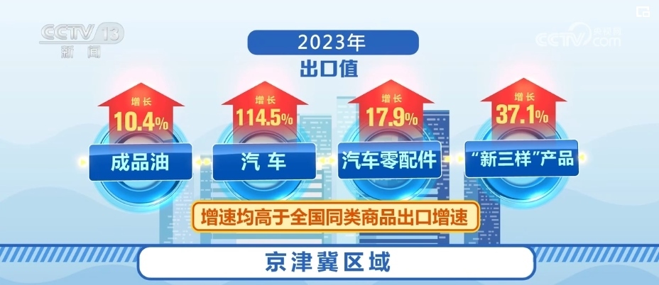 出口方面,2023年京津冀區(qū)域出口1.31萬(wàn)億元,增長(zhǎng)2.5%,占全國(guó)出口總值的5.5%。其中,成品油、汽車(chē)、汽車(chē)零配件、“新三樣”產(chǎn)品出口值分別增長(zhǎng)10.4%、114.5%、17.9%、37.1%,增速均高于全國(guó)同類商品出口增速。成品油出口量、出口值占全國(guó)成品油出口總量、出口總值的一半以上。