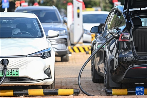 1月20日,新能源電動(dòng)汽車(chē)在位于海南省??谑械囊俪浜?谖捏w公園全液冷超充站充電。新華社記者 蒲曉旭 攝