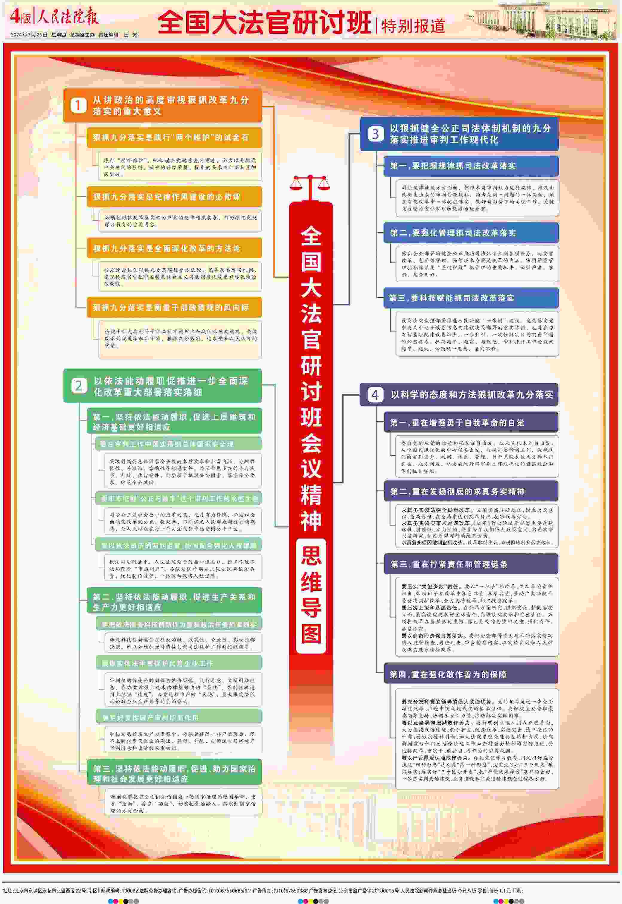 7月24日,全國(guó)大法官研討班舉行。此次研討班的主要任務(wù)是:堅(jiān)持以習(xí)近平新時(shí)代中國(guó)特色社會(huì)主義思想為指導(dǎo),全面貫徹落實(shí)黨的二十大和二十屆二中、三中全會(huì)精神,深入貫徹習(xí)近平法治思想,認(rèn)真學(xué)習(xí)領(lǐng)會(huì)黨中央關(guān)于進(jìn)一步全面深化改革的戰(zhàn)略部署,深化思想認(rèn)識(shí),狠抓九分落實(shí),加快推進(jìn)審判工作現(xiàn)代化,努力為以中國(guó)式現(xiàn)代化全面推進(jìn)強(qiáng)國(guó)建設(shè)、民族復(fù)興偉業(yè)提供有力司法服務(wù)保障。