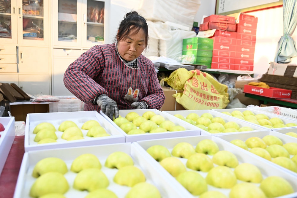 在陜西省渭南市白水縣秋林蘋果專業(yè)合作社,工人打包裝箱“瑞雪”蘋果(2025年1月9日攝)。新華社記者 李一博 攝