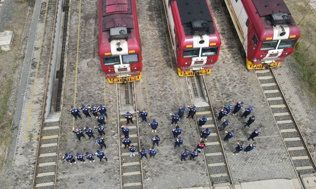 2025年8月19日,在肯尼亞內羅畢非洲之星鐵路運營有限責任公司機務運轉整備場,中肯兩國鐵路工作者在機車前站列并組成“3000”字樣,以紀念蒙內鐵路實現(xiàn)安全運營3000天(無人機照片)。新華社記者 楊光 攝