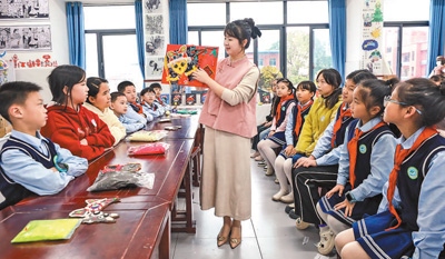 蘭楠帶領(lǐng)孩子們制作手工畫(huà)。