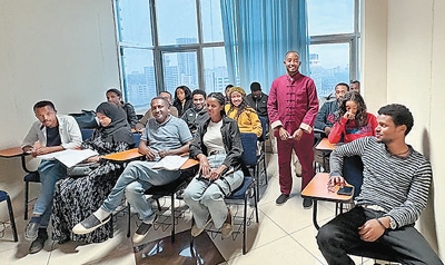 2021年,卡利布學成回到埃塞俄比亞,發(fā)現很多埃塞人有學習中文的需求,便開辦了“你好”中文學校。針對當地人的發(fā)音和學習習慣,開發(fā)了阿姆哈拉語和中文雙語教材,在當地中文教育領域獨樹一幟,吸引了上百名學員。這些學員不僅有即將赴中國留學的學生,還有與中國有生意往來的商人等。此外,卡利布教學內容的一部分是教中國人學習阿姆哈拉語,旨在幫助大家更好地融入當地生活。